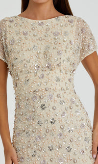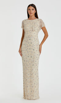 In soft oyster white, this short sleeve long beaded formal dress is sure to shine under the lights. With sequins, pearls and other embellishments from the high neckline to the hem, this elegant off-white evening gown is a dazzling choice for galas, nights at the opera, and other formal events. The gorgeous beaded long special-occasion dress has a short sleeve bodice and a hip-skimming long skirt that opens in the back for freedom of movement. A breathtaking choice for your big event, this short sleeve long beaded formal dress is pure sophistication in oyster white.