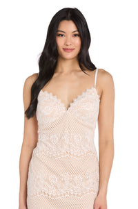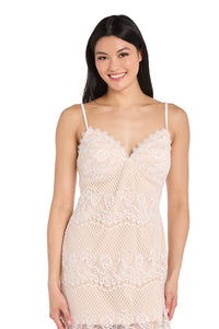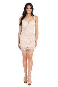 Raise the style bar in this short ivory lace party dress by Morgan. In junior sizes, this short ivory cocktail dresses is fully lined with a sheer lace overlay that offers a romantic, barely-there illusion. The nude lining extends slightly beyond the lace hem, adding a touch of contrast, while the peek-a-boo back keyhole ties into a dainty bow for a feminine look at rehearsal-dinner parties, cruises, and other semi-formal events. If you're looking for a fabulous short ivory cocktail dress in junior sizes, this one is sweet and sultry all in one charming mini dress.