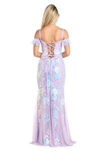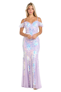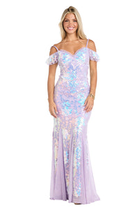 In soft lilac purple, this long sequin-print prom dress 19064 by Morgan is a celebration or sparkly style. In junior sizes, this long formal dress has eye-catching sequin floral prints from the cold-shoulder bodice to the hem, while thin bands lace up over the open back for the best fit. The long sequin-print purple print evening gown has ruffled banded sleeves that drape beautifully over the upper arms, while the long skirt smooths over the hips before reaching the floor. A stunning blend of dazzling style and timeless charm, this long purple sequin-print prom dress is a stand-out style for prom, galas, and other formal events.