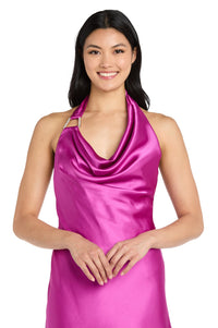 Sleek meets sexy in this open-back short magenta pink halter party dress by Morgan. The mini magenta cocktail dress has a graceful cowl neckline that drapes effortlessly over the decolletage, while a silver pendant detail graces one shoulder. The short magenta semi-formal dress stuns from every angle with it's open-back design and hip-hugging mini skirt that adds a flirty look for cocktail parties, weddings, and birthday parties. Captivate the night without saying a word in this open-back short magenta halter party dress by Morgan.