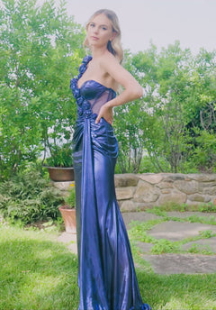 Designer metallic prom dress by Morilee featuring 3D rosettes along the one-shoulder neckline that cascade across the sheer corset bodice. This one-of-a-kind sleek prom dress also features a floor-length side sash that drapes over the front leg slit and ruching on the form-fitting skirt.