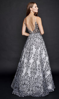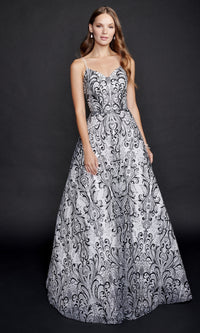 Sleeveless long a-line formal dress by Nina Canacci with a printed fabric, thin shoulder straps, and an open back.