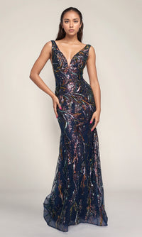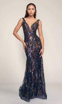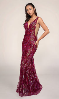 Sleek and sexy Nina Canacci sleeveless formal dress featuring a fitted silhouette, wide shoulder straps, a low v-neckline, and sheer side panels. The dress is fully adorned with hot stone embellishments.