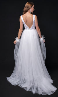 Sequin black sleeveless formal dress by Nina Canacci with a fitted silhouette, wide shoulder straps, a plunging low v-neckline, a low v-shaped open back with a zipper closure, ruffle cuffs at the wrist, and a floor-length tulle overskirt.