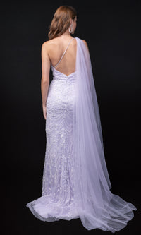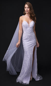 Beaded open-back long dress by Nina Canacci with a fitted silhouette. This dress features a sweetheart neckline with double spaghetti straps that cross over on one shoulder into the open back with an attached floor-length tulle sash, a back zipper closure and a thigh-high slit.