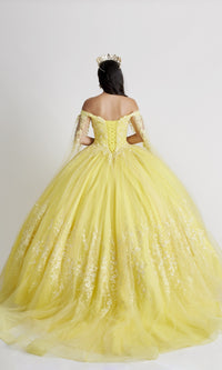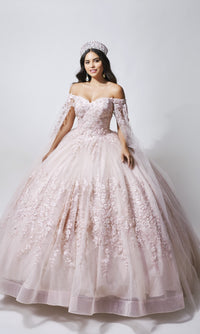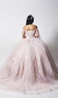 Feel magical in the Nina Canacci Q109 quinceanera ball gown. This dress features off-the-shoulder straps with cape sleeves, a fitted floral bodice with a sweetheart neckline, a lace-up back, and a full-length skirt with delicate floral accents.