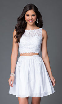Here's a short two-piece party dress that is as figure flattering as it is sparkly. The sweet semi-formal dress lights up the room with scattered sequins on the sleeveless lace crop top. A high neckline creates a stylish flair on this two-piece cocktail dress, while shoulder straps lead to the deep v-back detail. Matching sequins adorn the waistband of the short taffeta skirt as it flows to the hem in an a-line shape. Super cute for wedding receptions, sweet-16's, and homecoming, this two-piece short party dress is also budget priced.