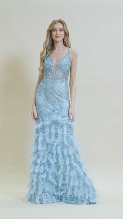 Here's a one-of-a-kind sequin prom dress with a stunning feathered skirt. Accented by 3-D flowers and soft feathers, the long skirt of this dress ends in an elegant train. Sparkling sequins create unique patterns from the sheer bodice to the horsehair hem of this feather prom dress. The plunging v-neckline features an illusion inset, and the corset-style lace-up back provides an adjustable and stylish fit. Ideal for formal dances, this sequin prom dress with feathers is sure to stand out in the best way.
