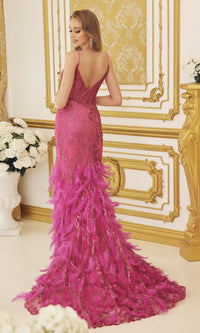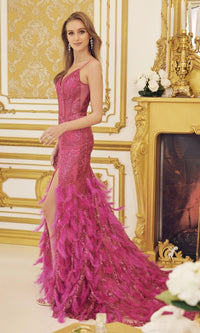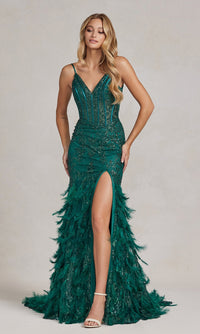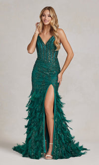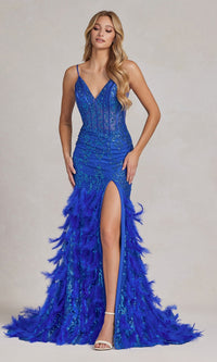 Festive with feathers, this shimmer prom dress is a head-turning style. A sparkling print embellishing this open-back prom dress from the v-neckline to the feathery hem. The sheer bodice features asymmetrical corset-style boning and illusion sides. The feather skirt flares of this sheer prom dress out softly and parts in a sultry side slit. For a trendy, yet sophisticated look at your next formal, wear this sheer-corset prom dress with feather skirt.
