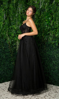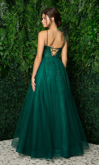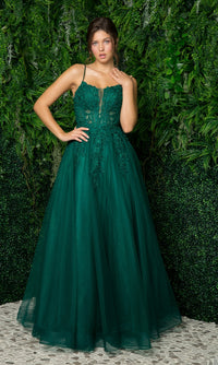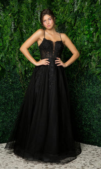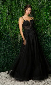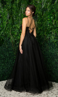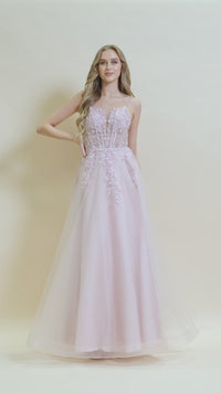 Here's a long prom ball gown that looks as if it were straight from a fairy tale. This gorgeous long formal dress has a beautifully embroidered sheer bodice with beaded shoulder straps that cross over the open back into a corset detail. The beaded embroidery continues to flow past the natural waist of this sweet evening gown, and onto the multi-layered long tulle skirt that ends in a structured horsehair hemline. Be a princess in this long pink ball gown for prom 2023.