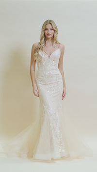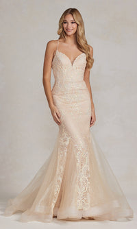 In sparkly lace, this long champagne mermaid formal dress is a beautiful sight to behold. The gorgeous long formal dress is crafted in sequin lace form the deep v-neckline to the hem of the floor-length skirt for a sparkly look at weddings, prom, and other formal events. The long lace evening gown has thin shoulder straps that criss cross the open back before lacing up for the best fit. The hip-skimming long skirt flows to the knees before sheer tulle godets provide volume for a true mermaid look. Offered in misses and extended sizes, this long champagne mermaid formal dress is surprisingly priced under $300.