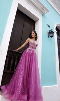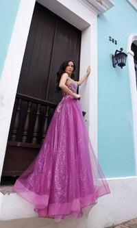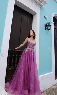 Be polished posh in this long magenta prom dress crafted in soft glitter tulle. This fabulous long magenta formal dress features beautiful embroidered lace on the v-neck bodice and thin shoulder straps that lace up over the open back for the best fit at prom, galas, and other black-tie events. The long magenta evening gown has matching embroidered lace at the hips, while the fully-lined long skirt has a sheer glitter-tulle overlay that flows to the floor in a flattering a-line shape that completes the design. Look and feel amazing when you choose to attend your very special event in this long magenta prom dress that shimmers with every move.