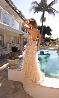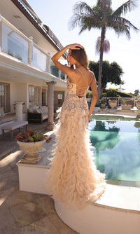 The Nox Anabel sequin prom dress is the ultimate in trendy styles this season. Featuring a dazzling sequin print and stunning feather skirt, this sparkly v-neck prom dress is destined for the spotlight. Double spaghetti straps round the shoulders before criss crossing against the open back to create a chic strappy design. The side slit enhances the allure to this glam backless prom dress. Feathered prom dresses are hot this season, so jump into this fun trend with this gorgeous designer style.