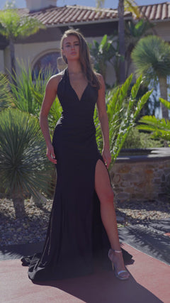 Check out this gorgeous open-back long v-neck halter prom dress C1723 by Nox Anabel. A curve-hugging choice for prom, galas, and upscale weddings, this long halter formal dress is crafted in stretch-jersey fabric from the v-neck bodice to the hem. The long evening gown has an asymmetrical empire waist and thick shoulder straps that attach at the neck. An eye-catching open back and a hip-hugging long skirt that opens in a side slit completes the look. At under $200, you can have this affordable open-back long v-neck halter prom dress that is a stunning blend of modern elegance and timeless charm.