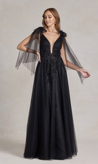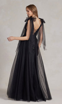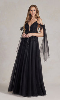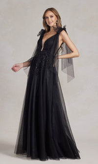 Gothic-style long black prom dresses are so unique, and this one is simply extraordinary. So eye-catching for prom, fancy formals, and other black-tie events, this long black evening gown is a bold style that is truly figure-flattering. The statement-making long black formal dress has sheer panels at the sides and at the plunging v-neckline, and dazzling beading at the waist that flows over the hips to the skirt. Sheer black fabric ties into feminine shoulder straps that drape over the arms, while a corset-style detail laces up over the open back of this fabulous long a-line dress. The fully-lined long skirt has a sheer black overlay that flows to the floor in a flattering a-line shape to finish the design. Priced under $300, this gothic-style long black prom dress allows you to showcase your daring personality without emptying your bank account.