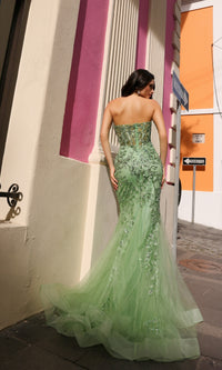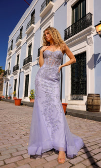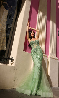 With beaded embroidery, this strapless long mermaid prom dress is the dress to dazzle for the big dance. Whether you're attending prom, a fancy gala, or another dance, this long strapless formal dress offers a sexy look with a sheer corset-style bodice that wraps around to the back. Offered in misses and some plus sizes, this elegant long evening gown has beaded embroidered floral designs that flow from the sweetheart neckline to the floor, while the fully-lined long mermaid skirt has a small train that adds to the drama. As sexy as it is dazzling, this strapless long mermaid prom dress is ready to shine at your very special event.