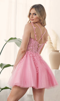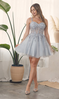 So sweet, this short babydoll homecoming dress is a feminine style with gorgeous details. With a sheer corset-style bodice, this v-neck short embroidered homecoming dress gets a sexy vibe, while thin shoulder straps attach to the sheer back that laces up for a great fit. The cute party dress has a fully-lined short skirt with an embroidered sheer overlay that shimmers as it flows to the hem in a flattering a-line shape. Adorable yet eye-catching for homecoming, school dances, and other semi-formal events, this affordable short babydoll homecoming dress, under $150, is offered in misses and extended sizes.