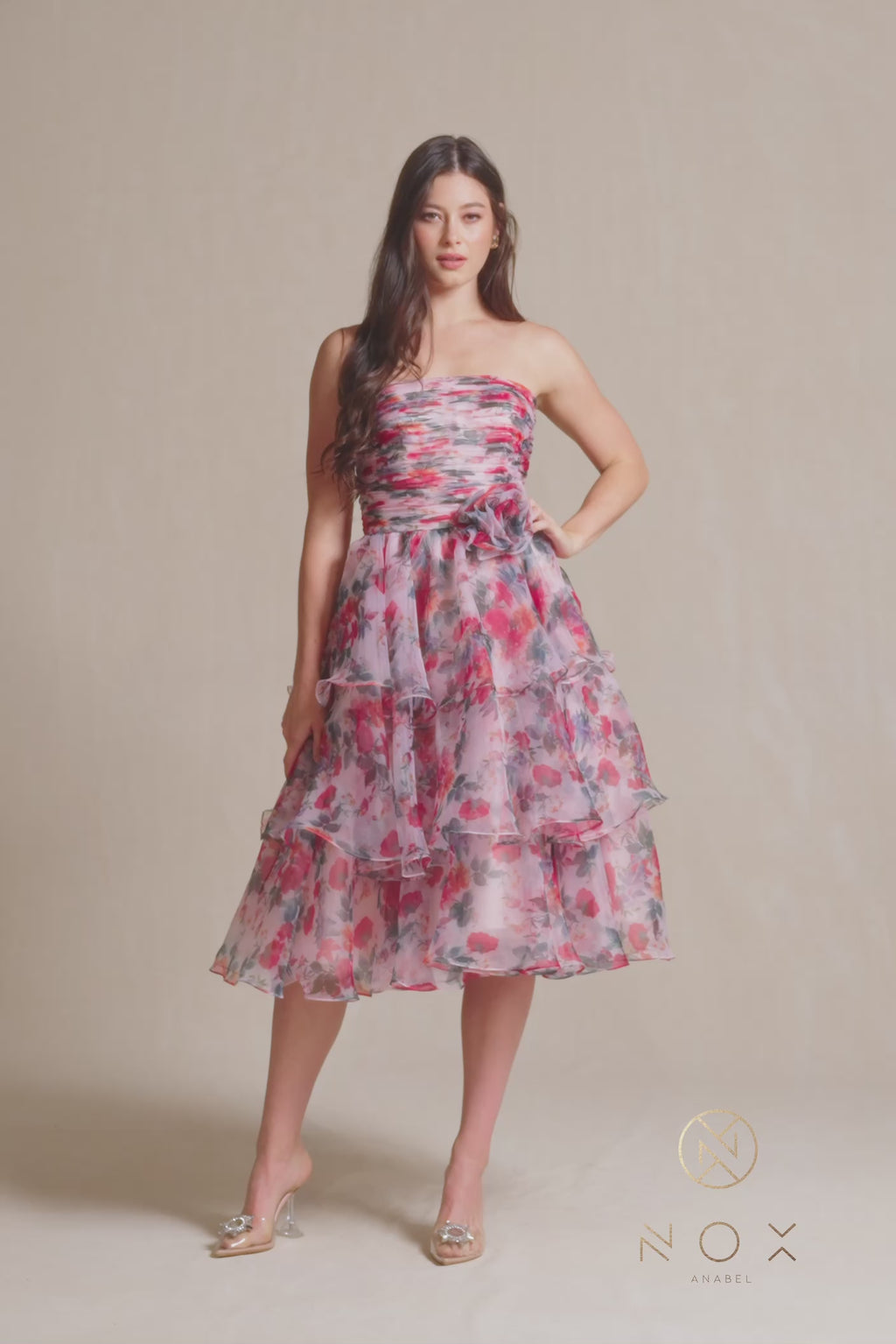 So pretty, this tea-length floral-print ruffled homecoming dress is sweetly feminine. With a ruched bodice that wraps around to the back, this strapless midi party dress gets a fitted look for homecoming, weddings, and other semi-formal events. The tea-length print cocktail dress has an a-line skirt that flows to the below-the-knees hemline in ruffled tiers that add to the feminine look. Priced under $200, this upscale tea-length print homecoming dress is as budget priced as it is adorable.