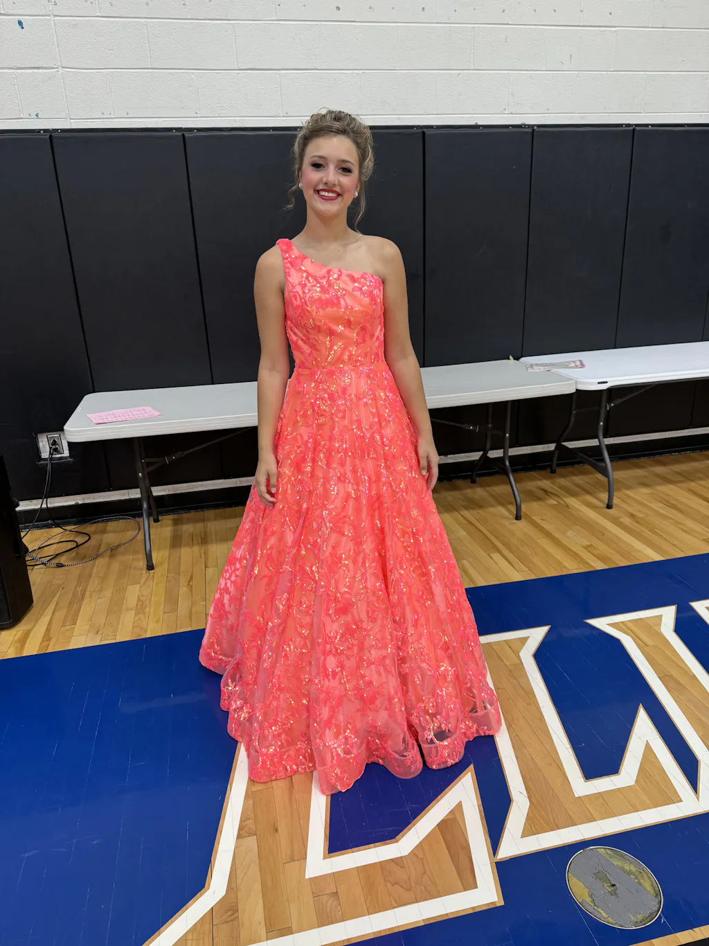 Bold, bright, and beautiful, this one-shoulder neon peach prom ball gown is everything for the girl who loves an eye-catching style. With a brilliant sequin print from the asymmetrical neckline to the floor, this gorgeous long formal dress is sure to shine at prom, galas, and other fancy events. The one-shoulder long neon orange evening gown has a fully-lined long a-line skirt with a sheer sequin-print overlay that flows to the floor with a flourish that completes the look. As stylish as it is sparkly, this one-shoulder neon peach prom ball gown is sure to be a hit on the big night.