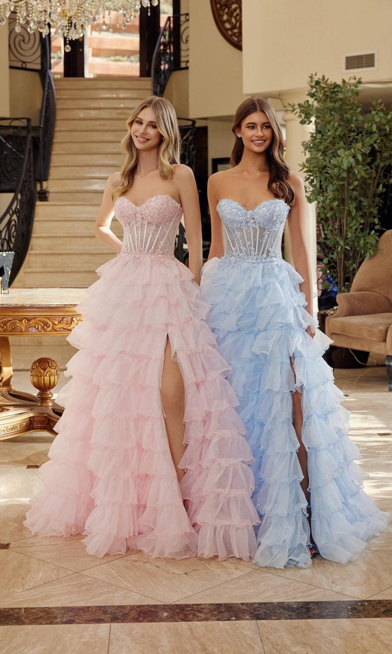 Behold the beauty of this strapless long ruffled prom dress R1688 by Nox Anabel. With beautiful embroidery on the sheer corset that wraps around to the back, this strapless long a-line formal dress has thin bands that lace up over the open back for the best fit. The strapless long evening gown has a fluffy long a-line skirt that flows to the floor in ruffled tiers for a classic look at prom, galas, and other formal events. A thigh-high side slit completes the look of this strapless long ruffled prom dress that is designed to make a statement at any formal occasion.