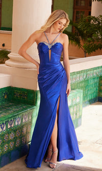 Shine bright in this long metallic prom dress by Nox Anabel. The epitome of modern glamour from the beaded sweetheart neckline to the hem, this long metallic formal dress is an eye-catching choice for prom, galas, and other black-tie events. The long metallic evening gown has a diamond-shaped front cut out and beaded shoulder straps that lead to the low back. The hip-skimming long skirt includes a thigh-high side slit and a small train that complete the look of this cut-out long metallic prom dress that is ready to wow the crowd.