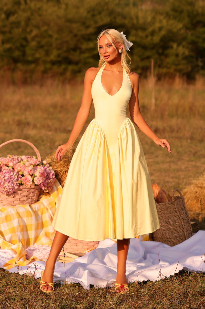 Buttercup Yellow Midi Halter Summer Dress: Solena