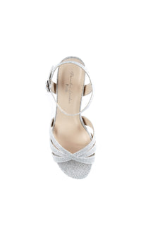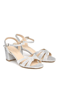 Open-toe sparkly silver prom shoes with 2.5-inch block heels and buckle closures.