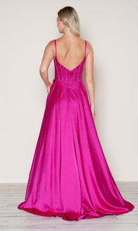Long a-line prom dress with a corset bodice, beading embellishments, thin shoulder straps, and pockets.
