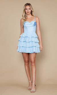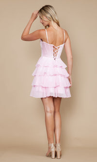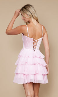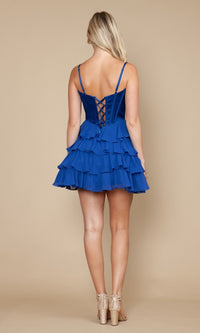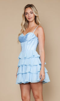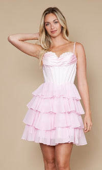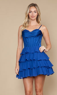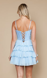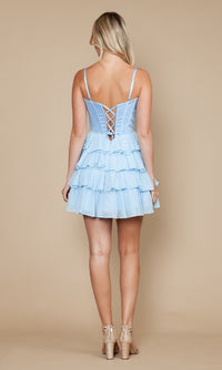 So cute, this lace-up short ruffled homecoming dress by Poly USA is both feminine and flirty. With a peek-a-boo beaded sweetheart neckline, this short party dress has just the right amount of sparkle for homecoming, weddings, and other semi-formal events. In misses and some plus sizes, this short cocktail dress has a corset-style bodice that wraps around to the lace-up back, while the short chiffon a-line skirt flows to the hem in ruffled tiers. Combining adorable style and modern details, this lace-up short ruffled homecoming dress is as figure flattering as it is feminine.