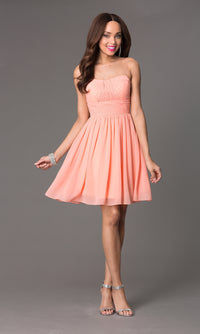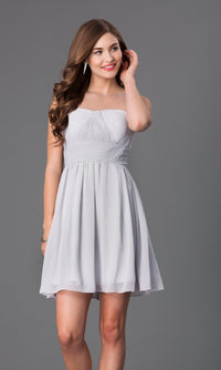 So stylish, this short a-line wedding-guest dress flatters the curves for your big night. Whether you're attending homecoming, a fancy wedding, or another semi-formal event, this short cocktail dress is sure to get endless compliments. With a sheer bateau neckline that flows to the v-back detail, this pretty party dress includes a band that wraps around the empire waist before tying in front. The fully-lined short skirt includes a sheer overlay that flows to the hem in a classic a-line shape. Offered in misses and some plus sizes, this short a-line wedding-guest party dress is sugar and spice and everything nice.