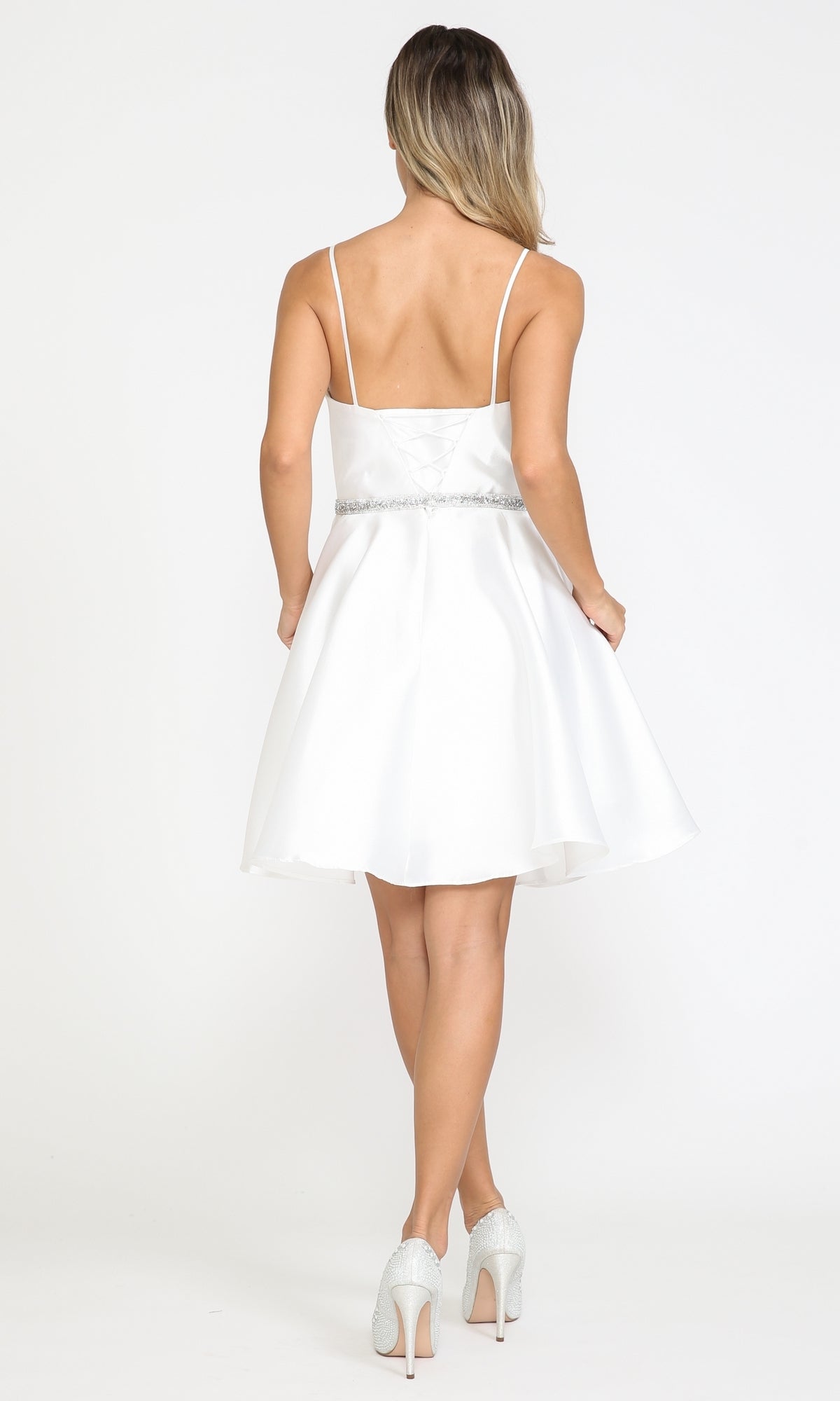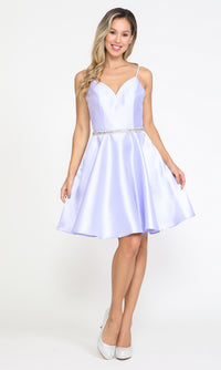 Cute and comfy, this short mikado homecoming dress is ready to twirl. With a figure-flattering a-line skirt, this pretty short party dress includes a v-neck bodice that gets a fitted look with thin bands that lace up over the open back. A sparkly rhinestone band wraps around the waist of this cute short dance dress for a shimmering look at homecoming, wedding receptions, and other semi-formal events. Side pockets add convenience to complete the look of this sweet short mikado homecoming dress that is surprisingly under $150.