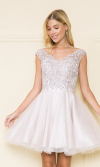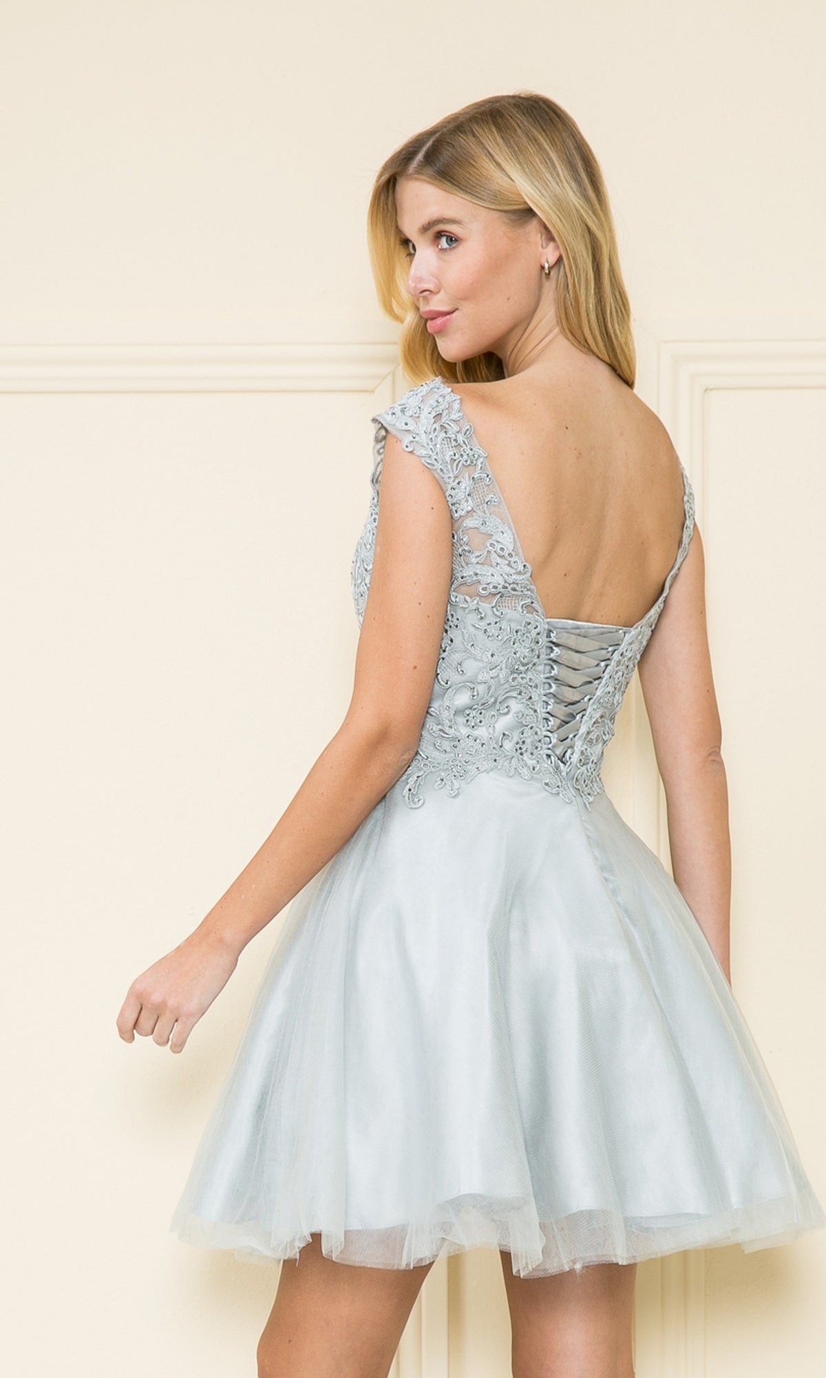 Sweet and sassy, this short babydoll homecoming dress is sugar, spice, and everything nice. With a shimmering v-neck lace bodice, this short a-line party dress gets a fitted look with a back corset detail that laces up over a modest triangle-shaped panel. Offered in misses and plus sizes, this adorable short semi-formal dress has a fully-lined short skirt with a sheer overlay that flows to the hem in a flattering a-line shape that completes the design. So cute for homecoming, sweet-16 parties, and other semi-formals, this short babydoll homecoming dress is one you'll want to wear again and again.