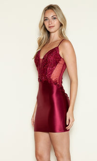 Accentuate the curves in this fabulous lace-up short corset homecoming dress 9412 from Poly USA. In misses and some plus sizes, this tight short cocktail dress has a sparkly embellished plunging v-neck bodice for a sexy look at homecoming, nightclubs, and other semi-formal events. The short tight party dress has sheer sides and thin shoulder straps that lead to the thin bands that lace up over the open back, while the hip-hugging short skirt adds an edgy twist. Priced under $150, this alluring lace-up short corset homecoming dress is sure to turn up the heat at your celebration.