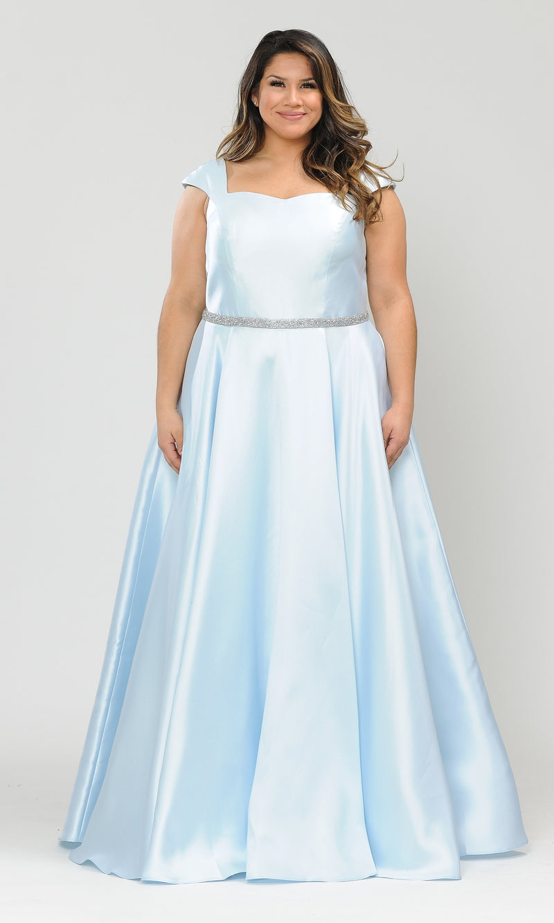 This plus-size long prom dress is ready to shine for your big event. Whether you are attending prom, a gala, or another formal soiree, this plus-size evening gown is richly styled from the sweetheart neckline to the floor. Cap sleeves top the shoulders of this plus-size long a-line formal dress, while a corset detail laces up over the open back with or without the modesty panel that is included. A rhinestone belt shimmers at the waist, while the long skirt flows in a figure-flattering a-line shape to the floor. Convenient side pockets complete the look of this sweet plus-size long prom dress that is a stand-out look for your memorable evening.