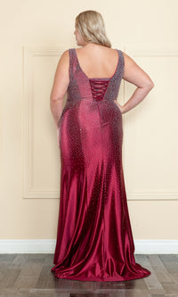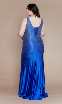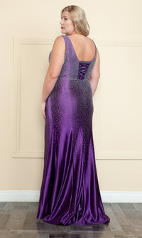 Here's a gorgeous plus-size long beaded prom dress that is sure to showcase the curves while sparkling under the lights. So chic for prom, galas, and other formal events, this beaded plus-size evening gown is crafted in curve-hugging spandex fabric from the deep v-neckline to the floor. Bra-friendly shoulder straps lead to the corset detail that laces up over your choice of either a modesty panel or over the open back of this plus-size tight long formal dress. Finally, the beaded long skirt opens in a side slit before flowing away from the knees to a dramatic floor length. All this for under $300, this plus-size long beaded prom dress is a real statement-making choice that won't cost a fortune