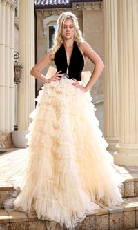 Halter ball gown by Portia and Scarlett featuring a black fitted bodice with a low v-neckline, a statement stylish cream bow accent at the zipper closure of the open back, and a voluminous cream floor-length tiered a-line tulle skirt that flows into a sweep train for a dramatic look.