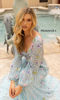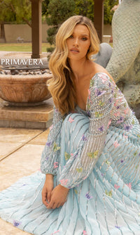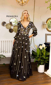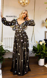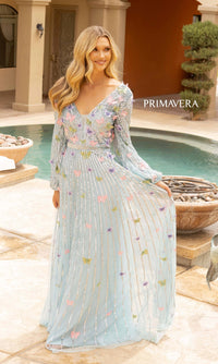 Beautiful butterflies make this long sequin formal dress a gorgeous sight to behold. From the v-neckline to the floor, this dazzling a-line evening gown features colorful butterflies and rows and rows of sequins. The long-sleeve formal dress has a deep v-neckline that is mirrored at the deep v-back detail, while the long skirt shimmers as it flows to the floor in a figure-flattering a-line shape. So pretty for prom, military balls, and other formal events, this sweet long a-line butterfly dress is offered in misses and some plus sizes.