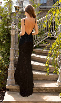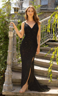 Here's a long sequin v-neck prom dress that is a hot pick of the season. Simply elegant, this long designer dress by Primavera 3904, is fully sequined from the v-neckline to the floor, while thin shoulder straps lead to the open back for an alluring look with every turn. The v-neck evening gown is fully-lined with a sheer sequin overlay that smooths over the curves before opening in a side slit and draping to the floor. Offered in misses and extended sizes, this long sequin prom dress by Primavera is ready to catch the spotlight whether you are attending prom, fancy galas, or other formal events.