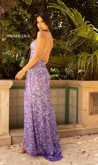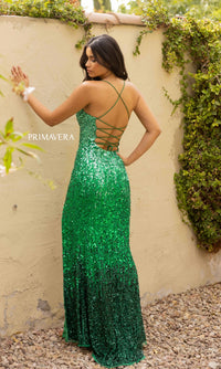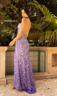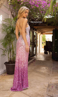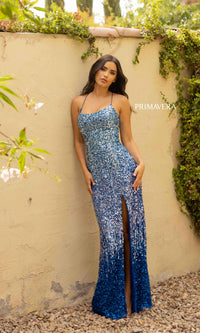 An Ombre pattern of sequins makes this open-back long prom dress a dazzling choice for your big formal. The sexy long prom dress has allover sequins from the scoop neckline to the floor, with shades of color getting darker as the sequins flow further down to the floor. The long sequin formal dress has thin shoulder straps that offer an alluring statement as they criss cross the open back before tying into an adjustable bow. Perfect for prom, galas, and other formal events, this long sequin teen dress is sure to stand out wherever you make your entrance. Offered in misses and extended sizes, this gorgeous long prom dress is ready to wow the crowd in Ombre sequins.