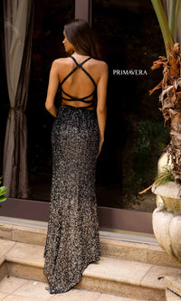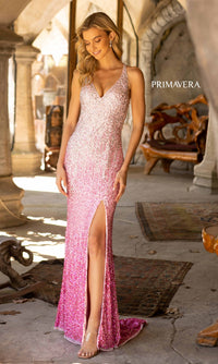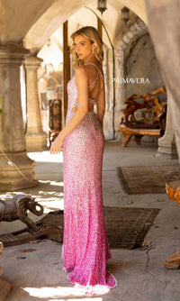 Flirty and fun, this sequin-ombre long prom dress is as playful as it is sparkly. Fully-sequined from the v-neckline to the floor, this long designer dress by Primavera 3922, gradually changes color from light to dark for a unique look at prom, military balls, and other fancy formals. The sequin evening gown has thin shoulder straps that criss cross over the open back, while the hip-skimming long skirt opens in a side slit before reaching the floor. A whimsical yet dazzling look for your big night, this ombre long sequin prom dress is sure to showcase your love of bold design.