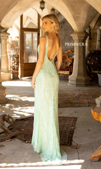 Glowing iridescent sequins make this long sequin prom dress a shimmering work of art. From Primavera 3927, this long designer dress has sequin patterns that flow from the v-neck bodice to the floor for a dazzling look for prom, elegant galas, and other formal events. The gorgeous long formal dress has supportive shoulder straps that lead to the deep v-back detail, and sheer panels at the sides for a sexy vibe. The backless sequin evening gown opens in a side slit to add to the sexy look, before the curve-hugging long skirt pools into a fancy train that follows behind. Offered in misses and extended sizes, this long sequin prom dress from Primavera is a refined style with plenty of sparkle.