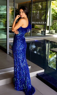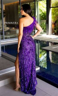 Here's a long sequin prom dress 4112 with all the dazzling details. Rows and rows of shimmering sequins create a sparkly design from the asymmetrical neckline to the hem of this one-shoulder long sequin designer dress. From Primavera, this curve-hugging long sequin evening gown is trimmed in floating feathers on the one-shoulder strap that wraps around to the back. Smoothing over the hips, the long skirt opens in a side slit to complete the look of this one-shoulder long sequin prom dress that is ready to wow the crowd at prom, galas, and other formal events.