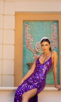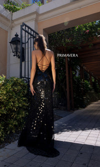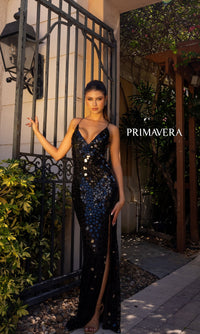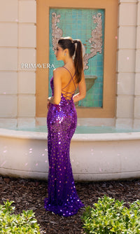 Like sparkly fireworks, this broken-glass long sequin formal dress 4151 shines under the lights like no other. With mirror-like broken-glass sequins from the v-neckline to the hem, this gorgeous long dance dress is a dazzling choice for prom, galas, and other black-tie formals. From Primavera, this sensational long designer dress has thin shoulder straps that lace up over the open back, while the tight skirt has a side slit that adds a sexy vibe to the party. Luxuriously radiant, this broken-glass long sequin formal dress is as richly designed as it is blazing hot!