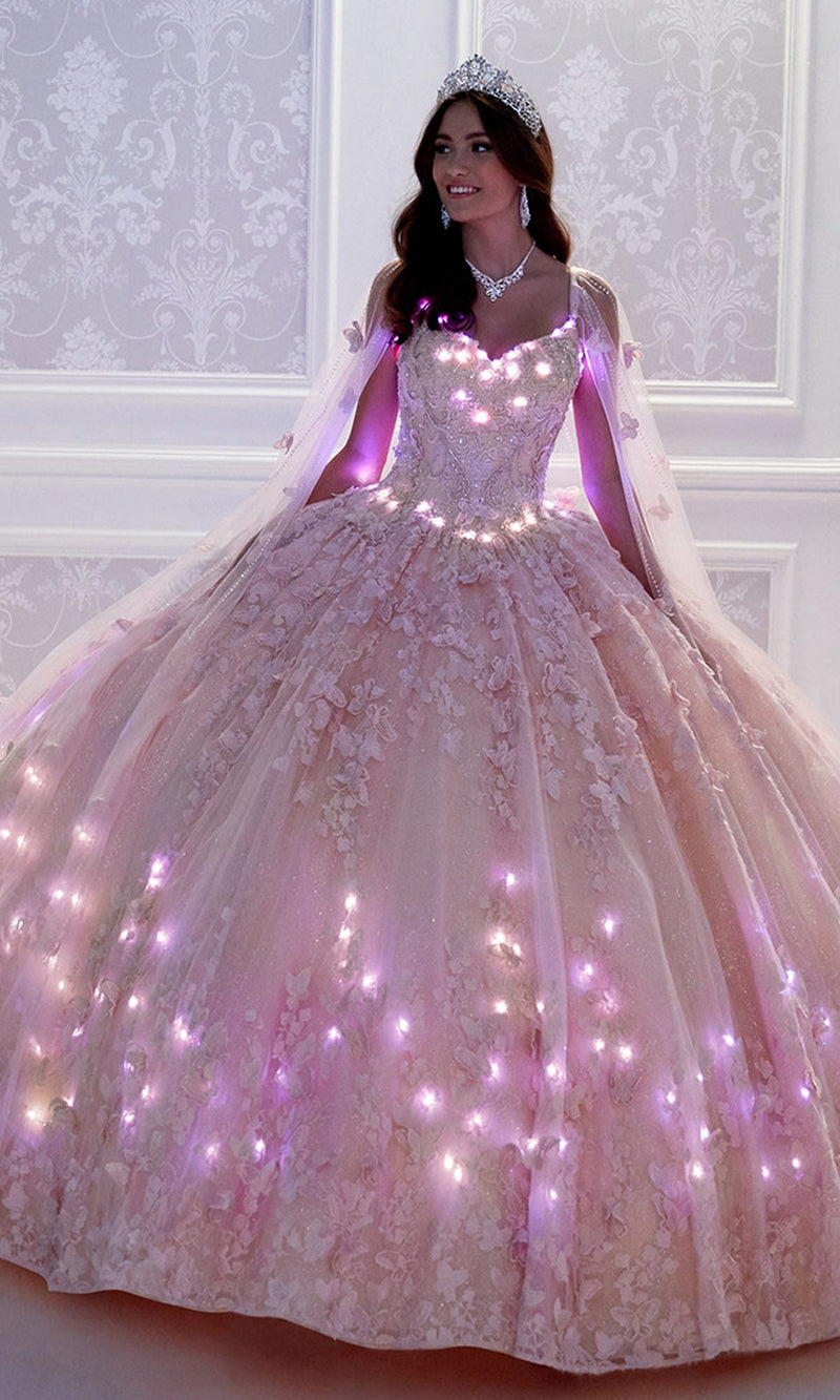 Details: Ball Gown, Beading & Stone Accents, Detachable Butterfly Cape, Embroidered Lace, Glitter Tulle, Matching Color Lights