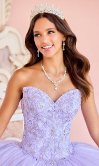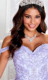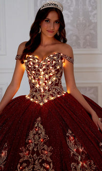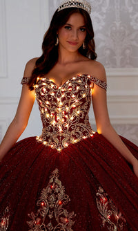 Wear this majestic quinceañera dress, from Princesa by Ariana Vara, for a show-stopping look both day and night. Glimmering beading and stone accents, as well as a voluminous glitter tulle skirt, catch the sun for daytime ceremonies, while matching lights in the bodice and skirt make this glow-in-the-dark quinceañera eye-catching for twilight parties. Glamorous embroidered lace highlights the bodice and wraps around the bottom of the poofy skirt on this quince ball gown. The detachable sleeves offer you the option of wearing an off-the-shoulder quinceañera dress or strapless quince dress, depending upon your preference. A short bolero jacket keeps you warm at chilly venues, and the corset back adjusts for a comfortable fit. Available in wine red and gold, lilac purple, light blue, this Princesa by Ariana Vara quince dress is sure to keep all eyes on you at your birthday celebration.