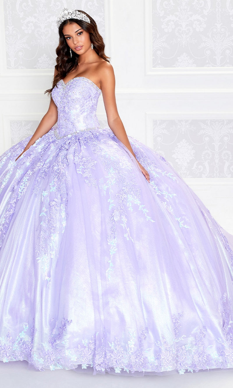 A woman poses in the Strapless Princesa PR12265 Quince Dress with Train, accented by a jeweled tiara and drop earrings, featuring lavender lace and intricate beaded detailing.