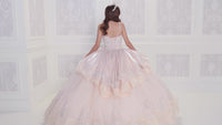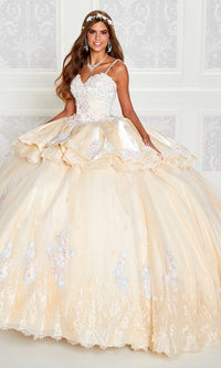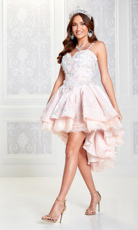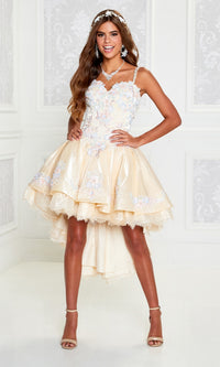 Here's a Princesa by Ariana Vara quinceañera dress with a removable skirt that gives you two gorgeous looks in one. The full and fabulous ball-gown style skirt is perfect for the formal ceremony and can be removed to create a fun and flirty short quince dress with a high-low skirt that makes dancing at your party a breeze. A beautiful blend of embroidered lace, Chantilly lace, and glitter tulle, this quinceañera dress is a sweet and sassy design. Beading and stone accents add a dash of sparkle, while 3-D flowers add springtime flair to this lace and tulle quinceañera dress. Shimmering double straps support the sweetheart bodice that boasts an adjustable lace-up corset in back. Available in butter or light pink, this Princesa by Ariana Vara quince dress is sure to turn heads with or without the removable skirt.