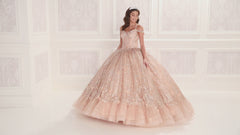 Glitter quinceanera dress with detachable ruffle off-the-shoulder straps, 3D flowers, stone and crystal accents, and a corset back.