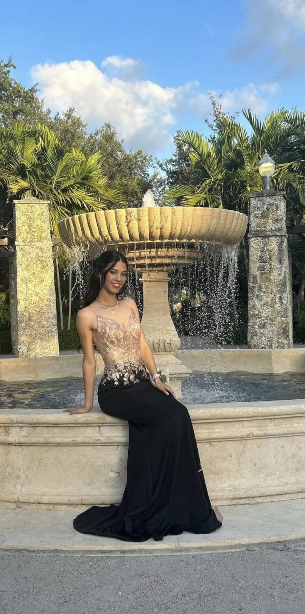 Sold exclusively at PromGirl, this dazzling v-neck formal dress features a metallic floral design on the sheer bodice for a sexy look. The metallic design on this fabulous evening gown then flows over the waist to decorate the sheer side of the fitted long skirt. A polished choice for prom, a pageant, or another red-carpet formal event, this long illusion prom dress showcases an edgy, yet classy vibe.