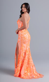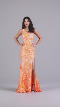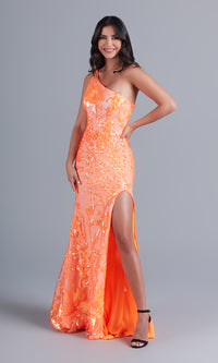 Bright and beautiful, this one-shoulder long prom dress shines with floral sequins. Sold exclusively at PromGirl, this fabulous long neon gown has sequin patterns that sparkle from the one-shoulder bodice to the hemline of the floor-length skirt for a gorgeous look at prom, fancy galas, and other black-tie formals. Offered in misses and plus sizes, this shimmering long designer dress has an asymmetrical neckline with one shoulder strap that diagonally stretches over the open back. The impressive evening gown smooths over the hips before opening in a side slit and pooling into a small train that adds the final elegant touch. As radiant as it is bright, this one-shoulder long prom dress by PromGirl is sure to catch the spotlight and make a dazzling fashion statement at your next formal.